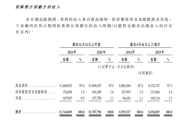 再看钱大妈“按业务分部划分的收入”这一维度。据其招股书,钱大妈2023年产品销售收入占同期总收入97.6%,2024年为97.5%,截至2024年9月30日止9个月为97.4%,截至2025年9月30日止9个月为97.3%。这组数据的“产品销售”数据,覆盖的不只加盟商渠道,也包括自营门店直销以及其他客户。