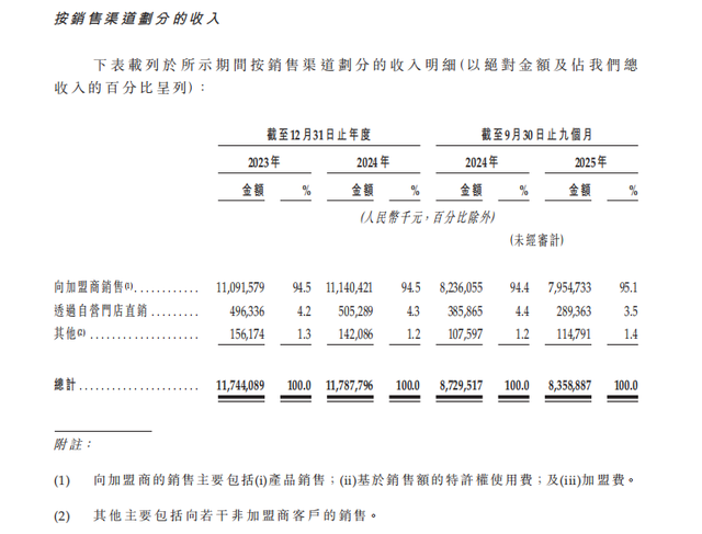 钱大妈的经营模式,不从门店开始,而是从“卖给谁”开始。其招股书显示,按渠道划分,2023年“向加盟商销售”收入占总收入94.5%,2024年为94.5%,截至2024年9月30日止9个月为94.4%,截至2025年9月30日止9个月为95.1%。这组数据并非只限于产品销售,还包含基于销售额的特许权使用费与加盟费。