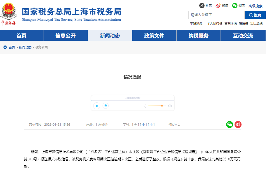 《情况通报》称,近期,上海寻梦信息技术有限公司(“拼多多”平台运营主体)未按照《互联网平台企业涉税信息报送规定》(中华人民共和国国务院令第810号)报送相关涉税信息,被税务机关责令限期改正但逾期未改正,之后进行了整改。根据《规定》第十条,依法对其处以10万元罚款。