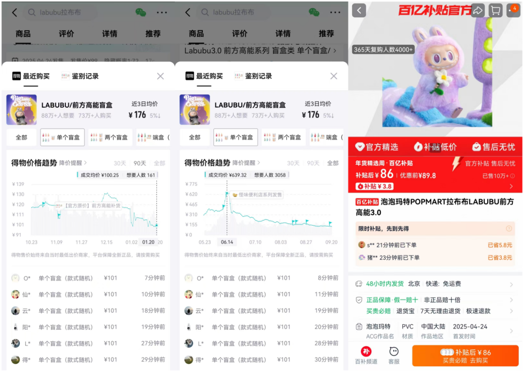 更为夸张的是,在天猫平台“百亿补贴”频道,一款未拆盒、未拆袋的盲盒最低售价86元,这甚至低于泡泡玛特本身的官方零售价。