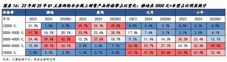 近两年,雅迪持续发力3000元以上的中高端产品,“冠能”“摩登”等系列精准补齐了高端、女性时尚等细分市场的产品矩阵,带动公司产品结构优化,其中,3000-4000元、4000-5000元价格带产品占比提升明显,在一定程度上提振了公司的单车均价和毛利率。