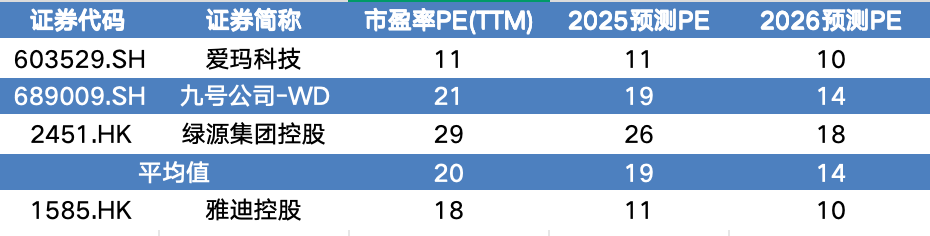 从估值维度看,目前雅迪控股的静态市盈率PE(TTM)维持在18倍左右,与九号公司等新势力处于同一定价区间。然而,若考虑2025年约29亿元的净利润预期,公司对应的远期市盈率则不足12倍,远低于可比公司的均值水平。