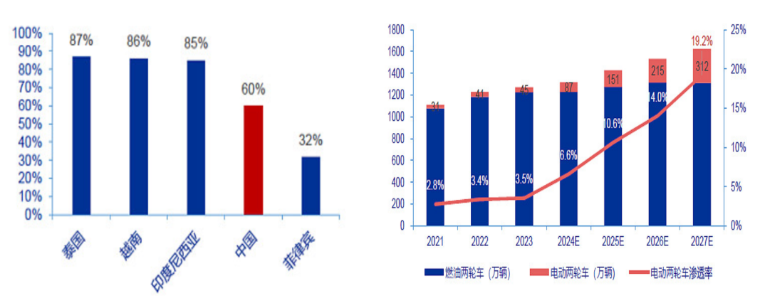 根据申万宏源的数据,目前东南亚摩托车家庭拥有率较高,截止2023年,泰国、越南、印尼的摩托车家庭拥有率达到87%、86%和85%。但其中,电动摩托车渗透率却仅在3.5%左右。这意味着,在政策驱动下,2025—2027年,东南亚的存量替代规模预计将达到680万辆。