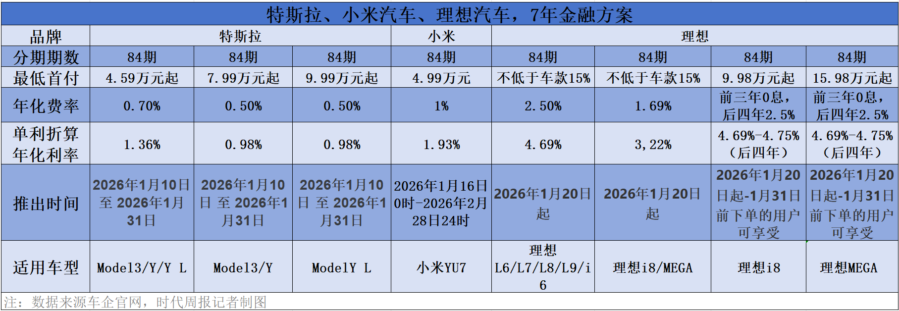 例如,小米汽车的“7年低息”针对的只有小米YU7一款;特斯拉的年化费率相对较低,且最低可低至0.50%;理想除了全系享用的“7年低月供”,还针对理想i8和理想MEGA推出了“7免3”,即贷款7年,前3年享受0息,后4年需要支付利息。