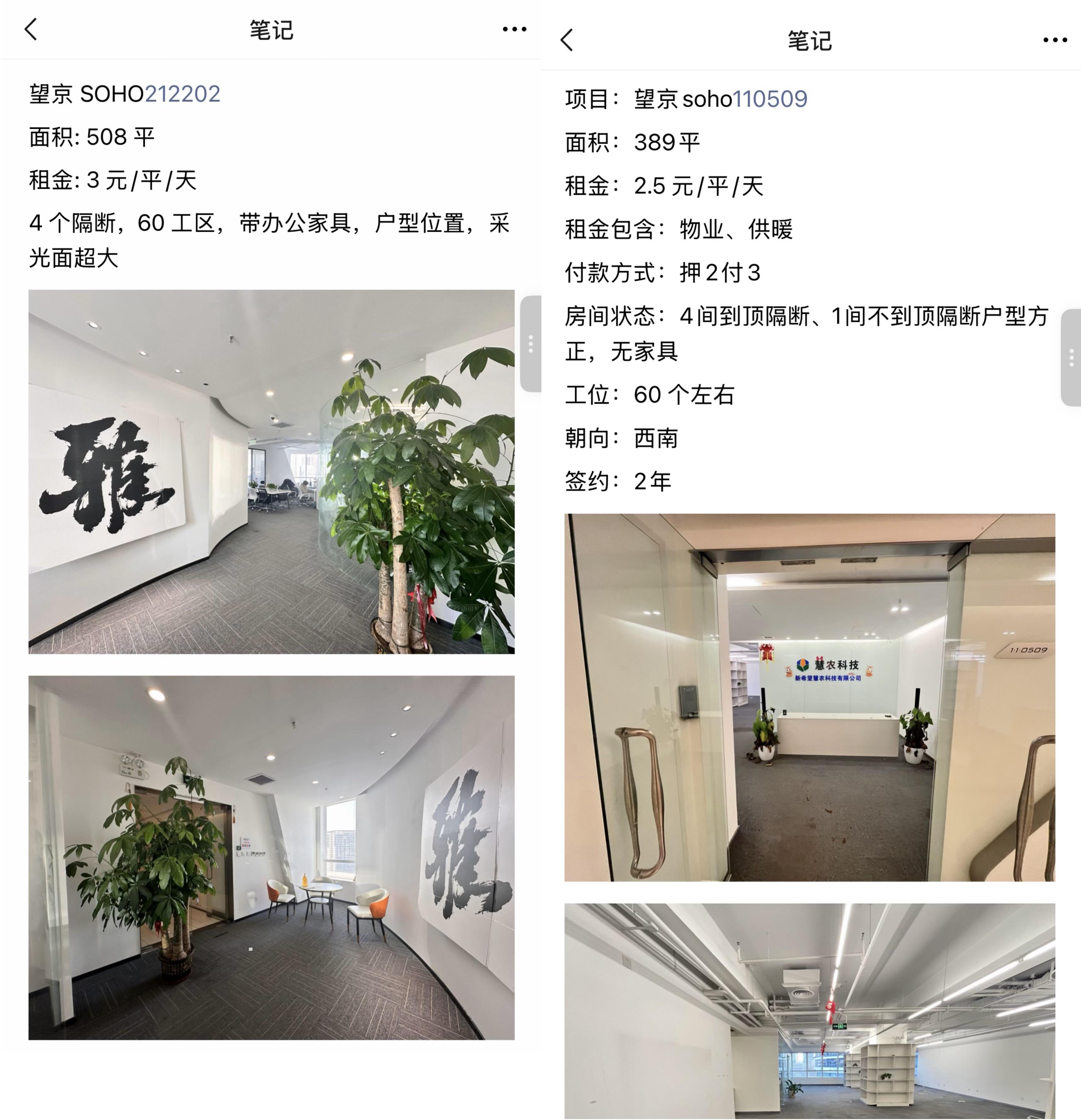 时代周报记者以租客身份询问了望京地区负责租赁写字楼业务的房产中介,据中介介绍,整体而言,望京SOHO目前的租金价格在3元/平米/天左右。如果需要自己装修,能接受房况较差的可能2元/平米/天可以租到;如果要是需要配齐家具、拎包入住,则价格一般在3-3.5元/平米/天;而望京SOHO附近的融科望京中心租金更低,价格在2.7-2.8元/平米/天。