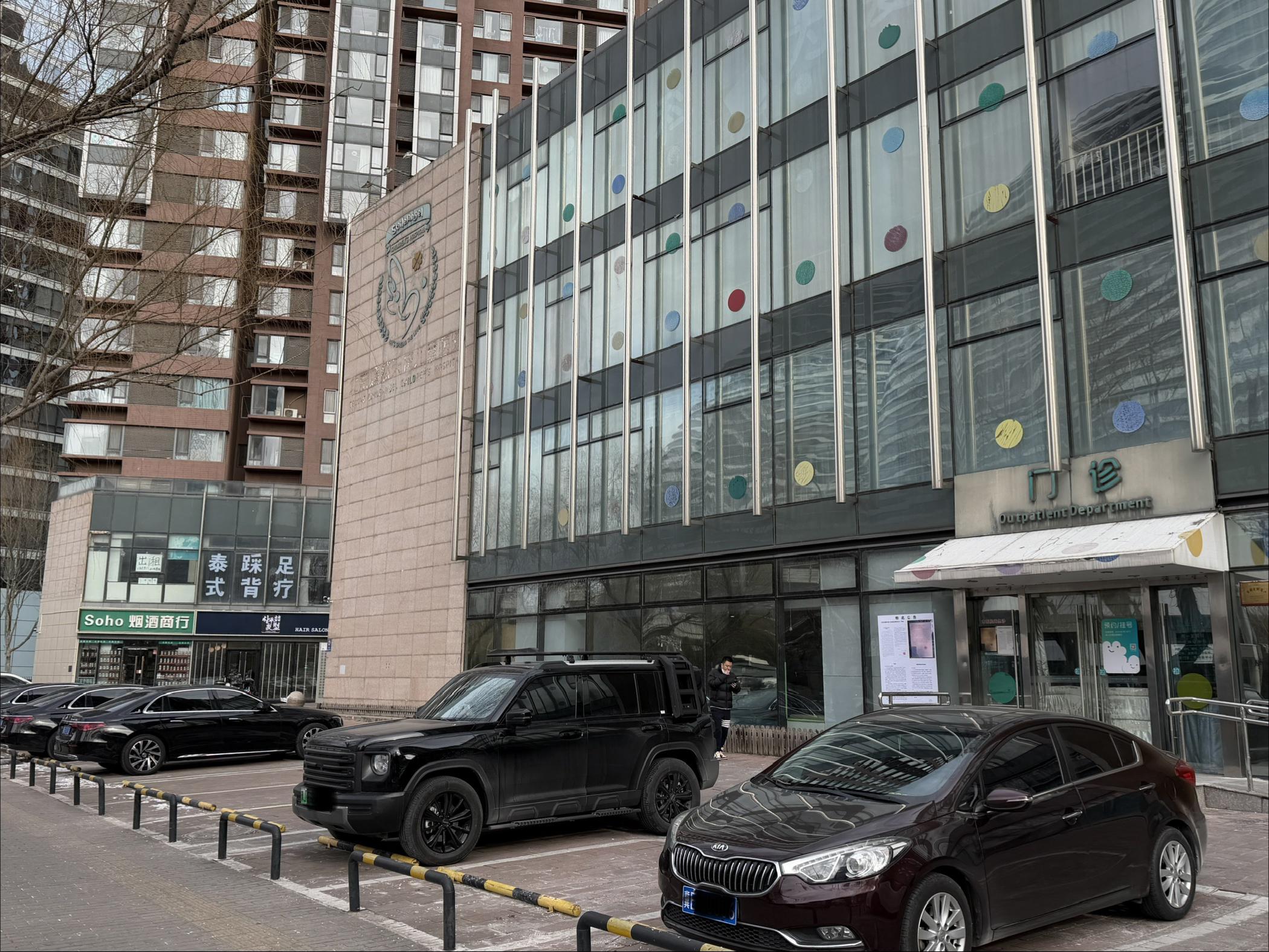 医院位于北京市朝阳区的望京地区,与望京地区的地标望京SOHO仅隔一条马路。医院在周围一片高层建筑中不算显眼,门前停有几辆京外地区牌照的车辆。