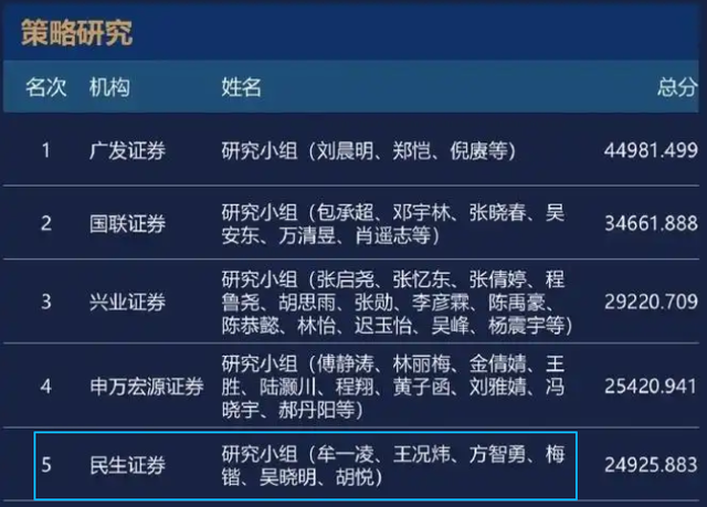 2024年12月,牟一凌带领的民生证券策略团队,在新财富最佳分析师评选中,获得了第五名的成绩。