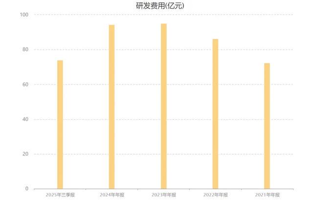 你看研发费用不但很高,而且几乎每年还在增长,就2024年因为压力实在太大,研发费用94亿,和2023年基本上持平。