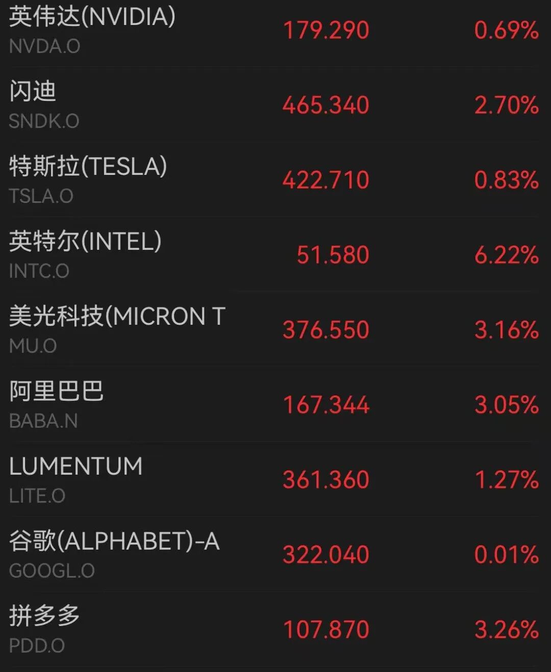 芯片股走强, 英特尔、 ARM涨超6%,西部数据、 美光科技 涨超3%, 闪迪涨近3% 。科网股普涨,特斯拉、谷歌、英伟达均走高。