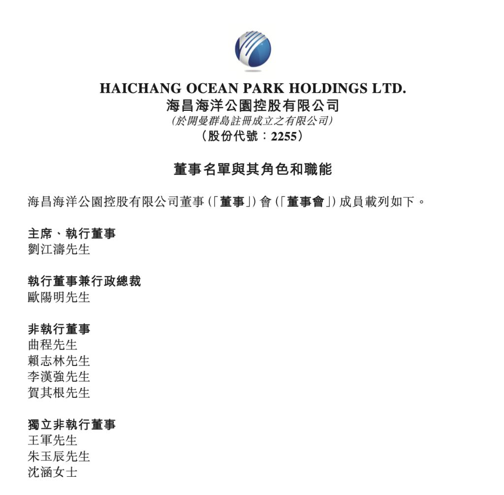 海昌海洋公园:俞发祥辞任,刘江涛已获委任为董事会主席