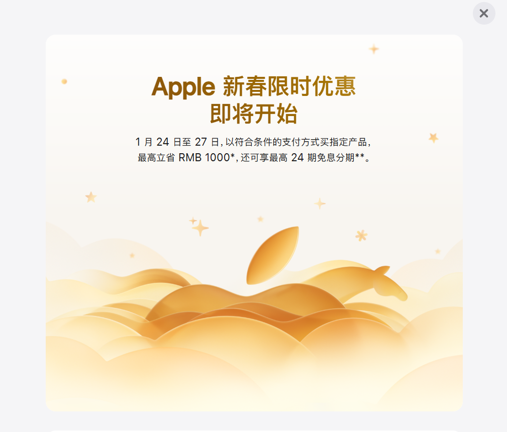 苹果中国官网最新上线新春限时优惠活动,用户于2026年1月24日0时1分至1月27日23时59分以符合条件的支付方式购买iPhone、Mac、iPad和Apple watch等指定产品最高立省1000元。但最新发布的iPhone 17系列手机产品不在降价范围内。