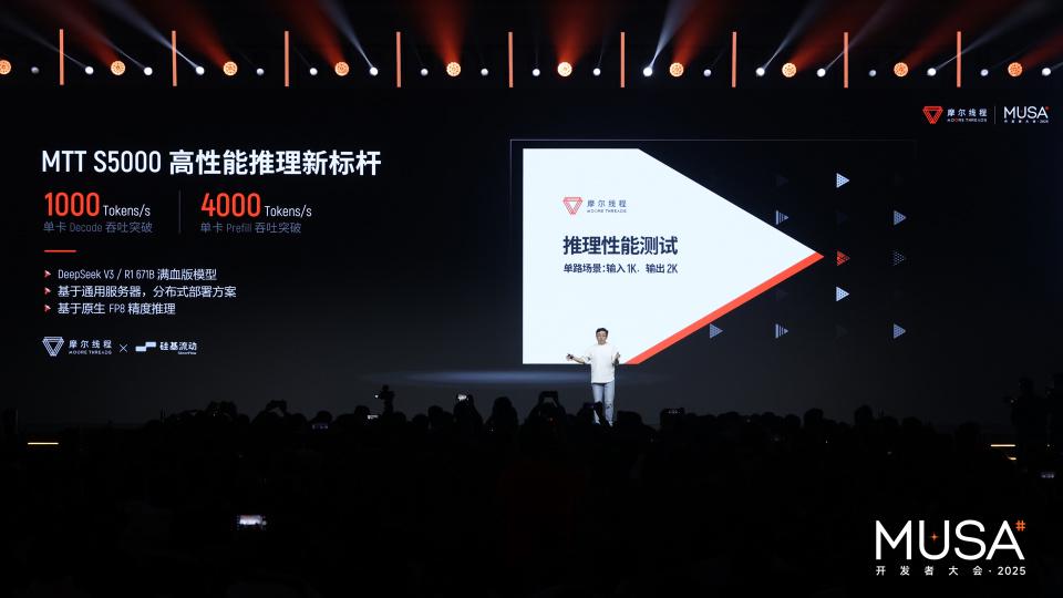 比如,摩尔线程打造的旗舰级训推一体全功能GPU智算卡MTT S5000,其性能达到市场领先水平,并已实现规模量产。基于该产品构建的大规模集群已完成建设并上线服务,可高效支持千亿到万亿参数大模型训练,其计算效率达到同等规模国外同代系 GPU 集群的先进水平。