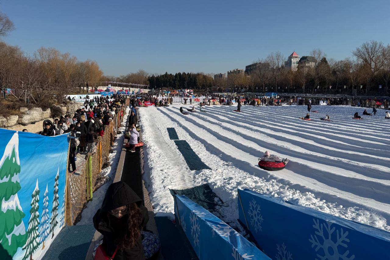 在陶然亭公园,众多游客体验“雪上飞碟”的乐趣。