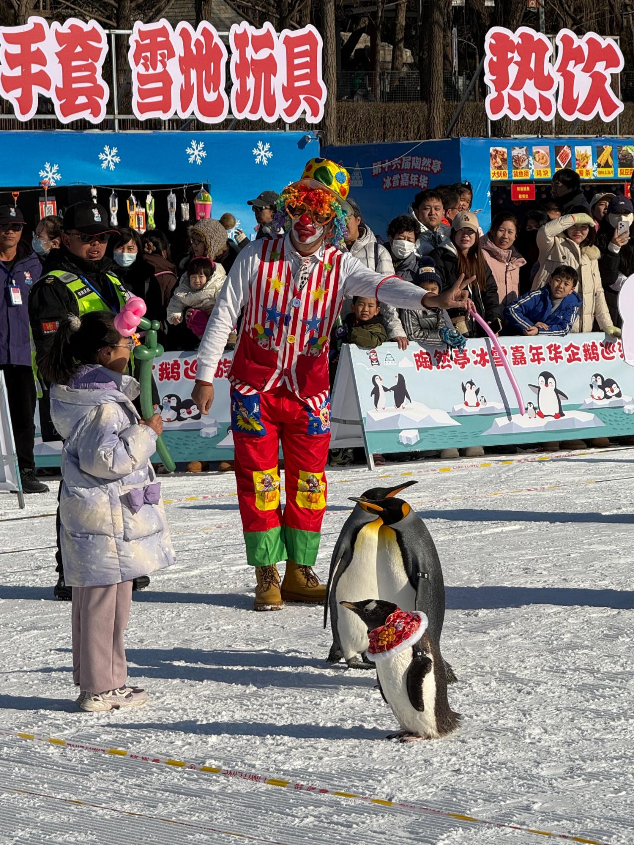 陶然亭公园与颐和园、什刹海的古典风格不同,以丰富趣味冰雪项目吸引亲子家庭。公园内,雪上飞碟、冰滑梯等热门项目惊险刺激,企鹅巡游吸睛无数,家长与孩子共同戏雪,欢声笑语中尽显温情。