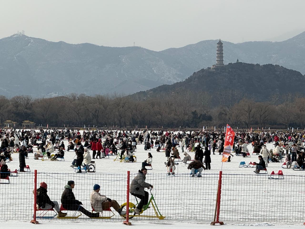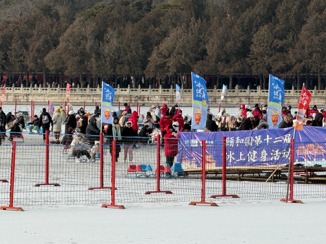 在颐和园冰场,人们游乐的身影与古建筑的剪影相互交融。
