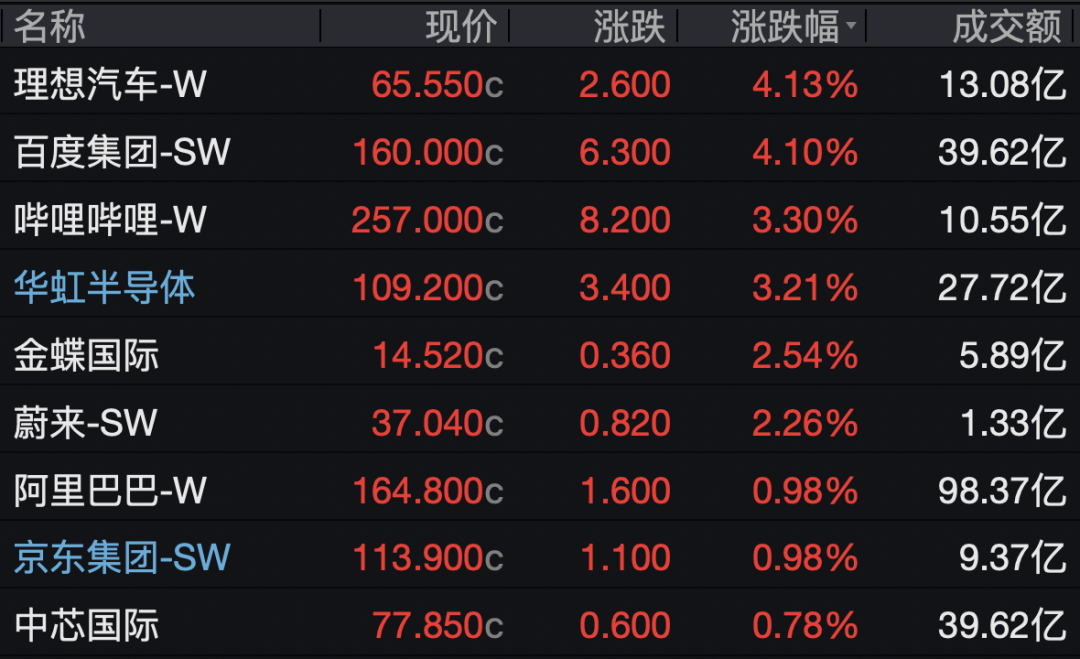 科网股走势不一,百度集团涨逾4%, 文心大模型5.0正式版新上线;理想汽车同样涨超4%,哔哩哔哩、 华虹半导体涨逾3%,阿里巴巴、京东集团涨近1%。