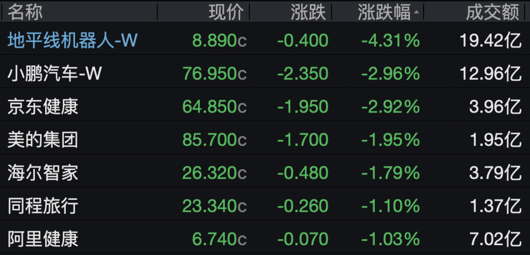 跌幅方面,地平线机器人跌逾4%,小鹏汽车、京东健康跌近3%。