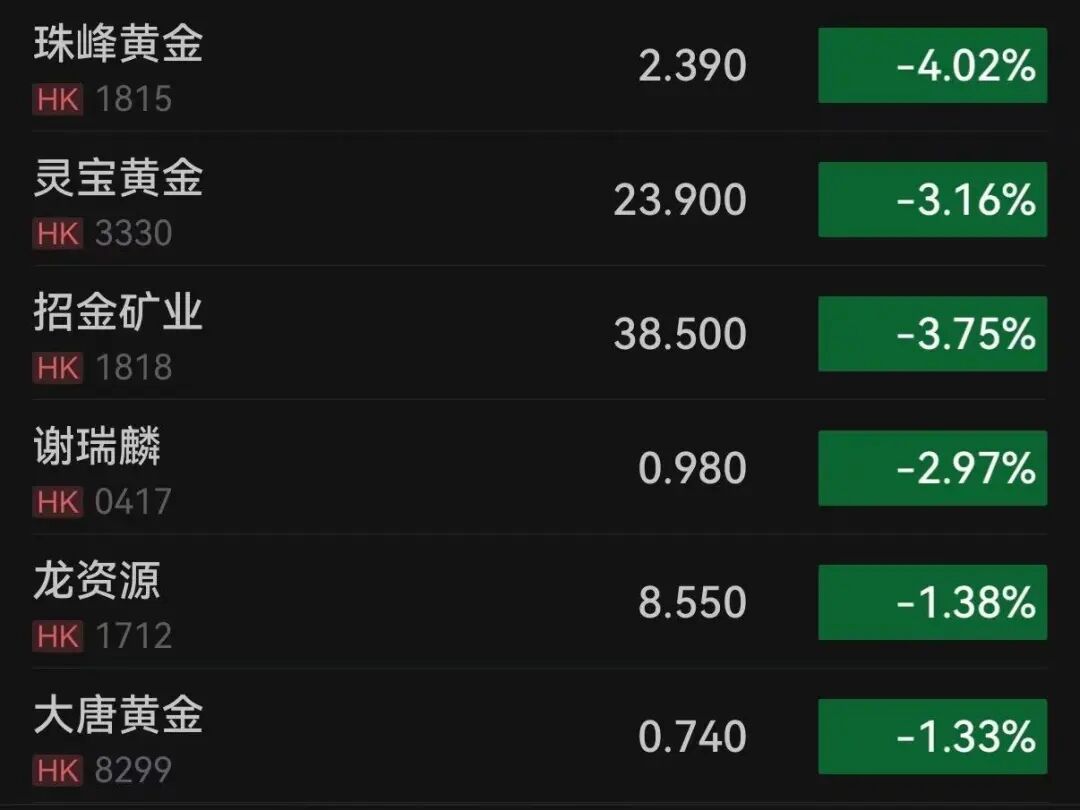 黄金股回调,珠峰黄金跌超4%,灵宝黄金、招金矿业跌超3%。
