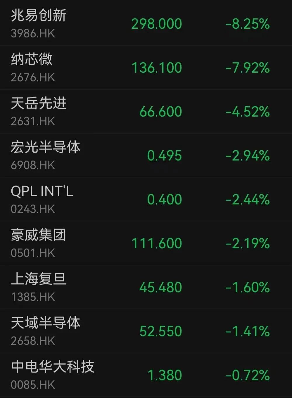 半导体、 芯片股高开低走,兆易创新跌超8%,纳芯微跌近8%,天岳先进跌超4%。