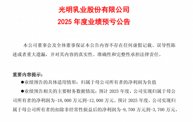 近日,光明乳业发布了2025年度业绩预亏公告。公告显示,预计2025年度公司实现归属于母公司所有者的净利润为-1.8亿元至-1.2亿元,与上年同期相比将出现亏损。同时,预计2025年度公司实现归属于母公司所有者的扣除非经常性损益后的净利润为-9700万元至-3700万元。