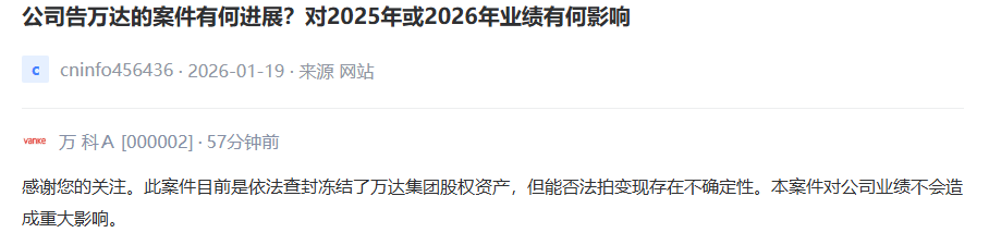红星资本局1月22日消息,针对投资者关于“公司告万达的案件有何进展?对2025年或2026年业绩有何影响?”的提问,今日,万科A(000002.SZ)在互动易平台回应称,“此案件目前是依法查封冻结了万达集团股权资产,但能否法拍变现存在不确定性。本案件对公司业绩不会造成重大影响。”