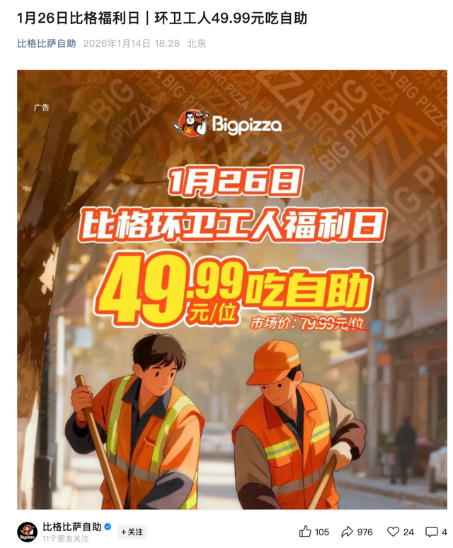 营销费用占比攀升的同时,比格的促销策略也在同步调整。2026年1月14日,比格比萨发布了一则“环卫工人福利日”宣传海报。根据海报内容,1月26日国际清洁能源日当天,环卫工人凭工作证或身着工作服到店,可享49.99元每位的自助优惠,市场价为79.99元。