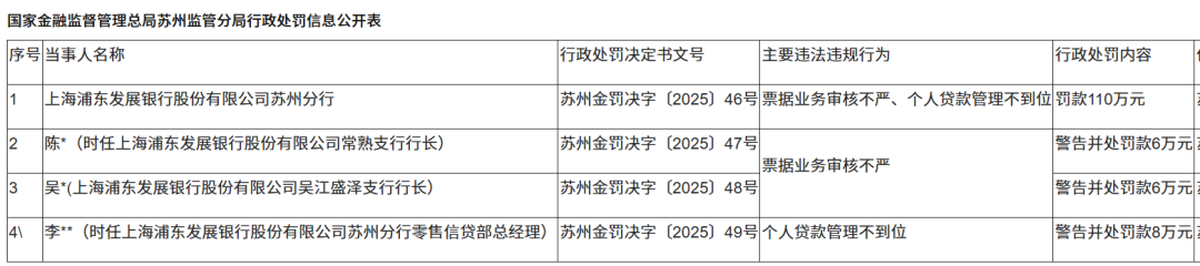 另外这并非浦发银行2026年以来的首张大额罚单。如上图,早在1月5日,浦发银行苏州分行就因票据审核不严、个人贷款管理不到位,被罚款110万元。