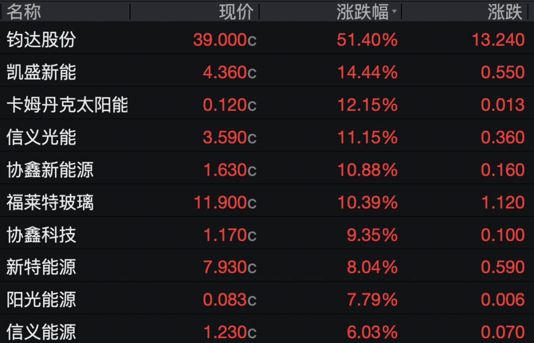 光伏产业链大涨,钧达股份涨超51%,凯盛新能、信义光能、协鑫新能源均涨超10%,阳光能源、新特能源等均走高。