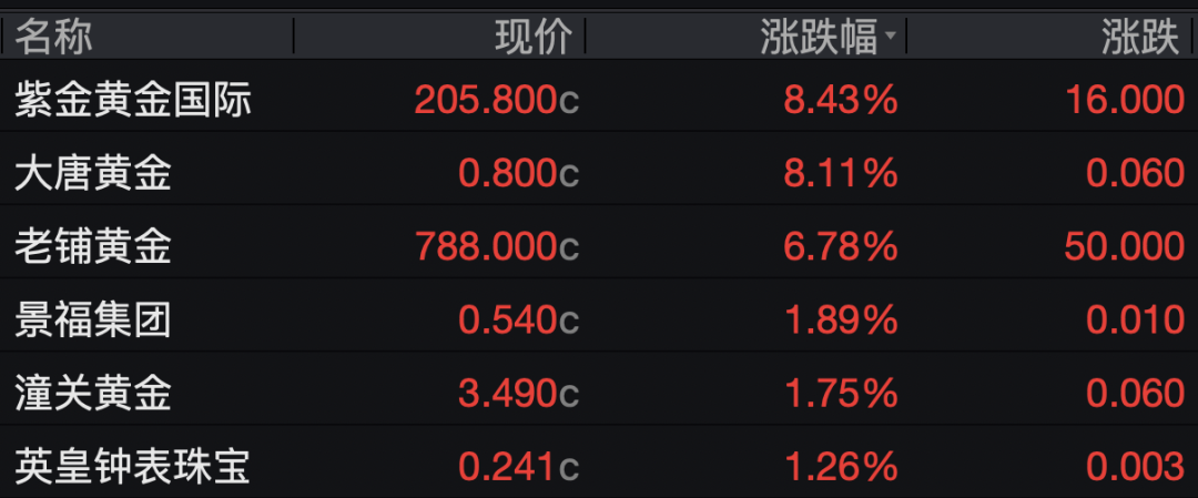 黄金股强势,紫金黄金国际、 大唐黄金 涨逾8%,老铺黄金涨逾6%。