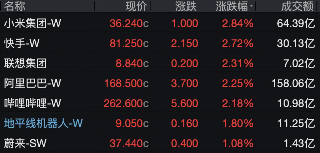 科技股多数上涨,小米集团涨近3%,阿里巴巴、快手、联想集团、哔哩哔哩等涨超2%。