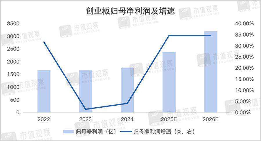 以创业板为例,据Wind数据显示,近年来上市公司的整体净利润增速逐年走高,2023年同比增长了1.39%至1674.91亿,预计2025年将达到2377.6亿,同比增速达34.49%。