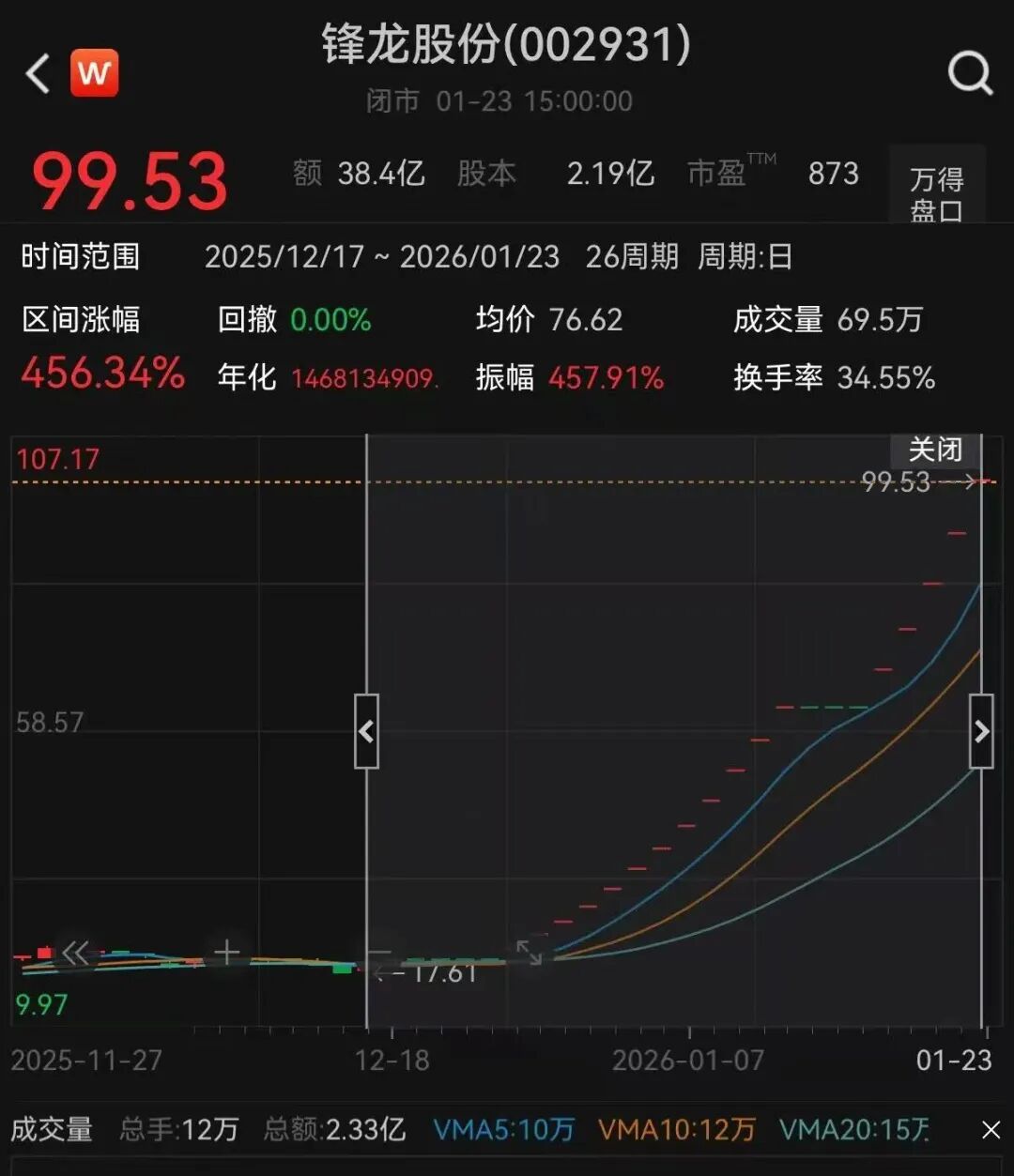 盘面上,截至23日收盘,锋龙股份再度涨停,走出18连板行情。本轮行情自2025年12月17日启动,期间累计涨幅超450%。