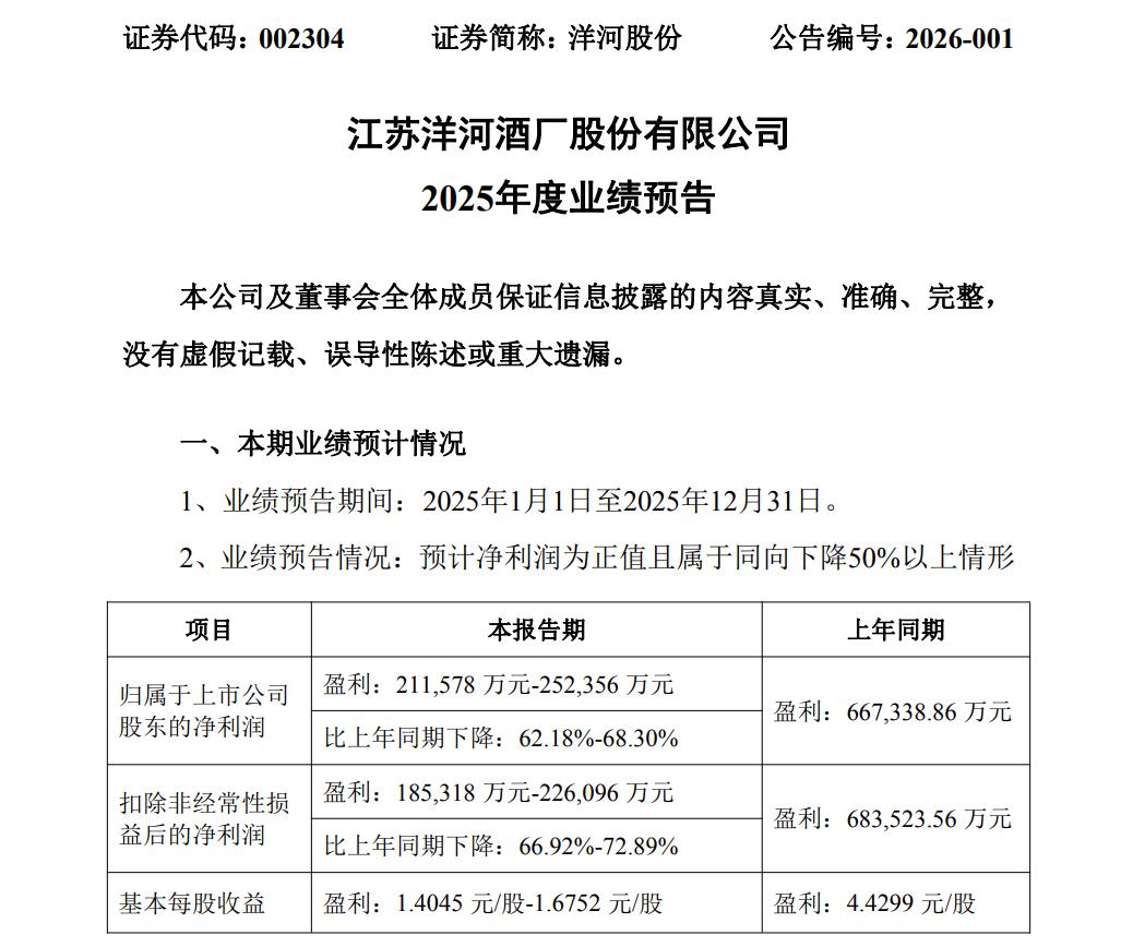 1月23日晚间,江苏洋河酒厂股份有限公司(洋河股份,002304.SZ)发布业绩预告,公司预计2025年度归属于上市公司股东的净利润21.16亿元-25.24亿元,同比下降62.18%-68.30%;扣除非经常性损益后的净利润18.53亿元-22.61亿元,同比下降66.92%-72.89%;基本每股收益1.40元-1.68元。