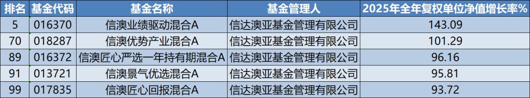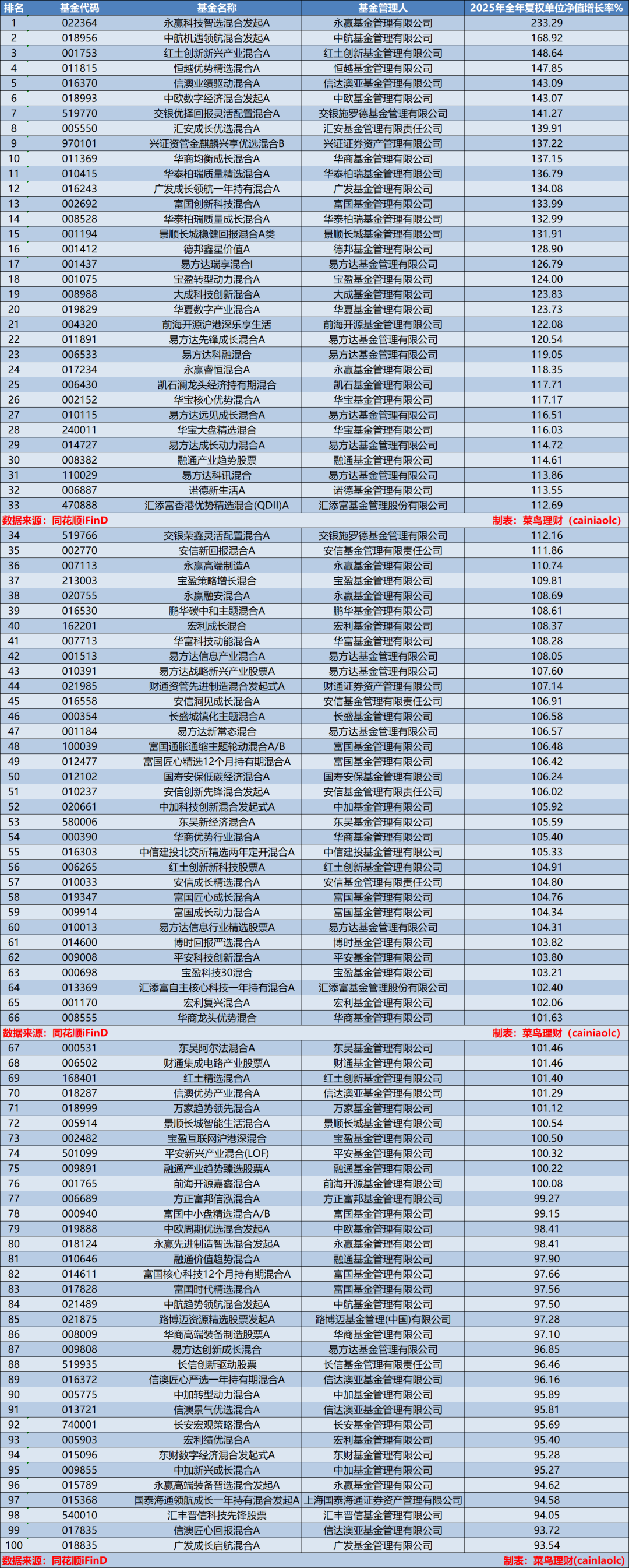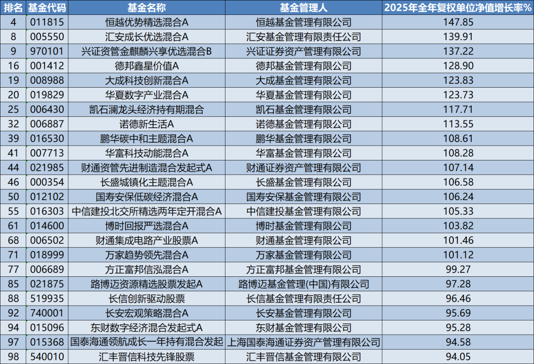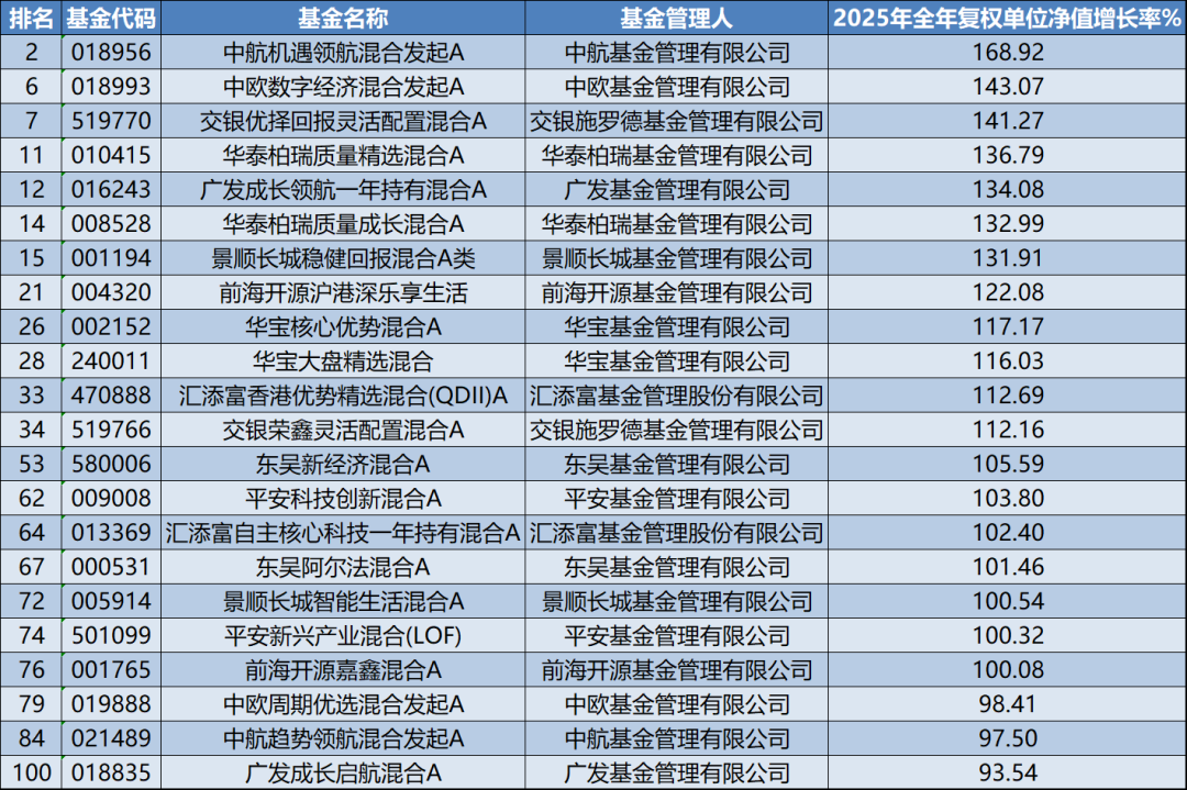 我最近粗略筛了2025年主动权益基金业绩排名前100的基金,详情如下: