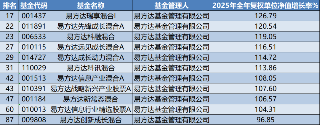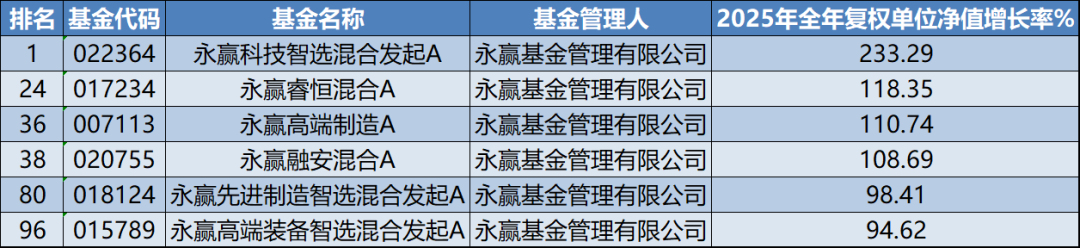 不仅拿下了冠军(永赢科技智选),还在榜单中后段(第24名、第36名、第38名、第80名、第96名)多次出现,显示出该公司在2025年的整体策略非常成功,尤其是在科技和高端制造领域。