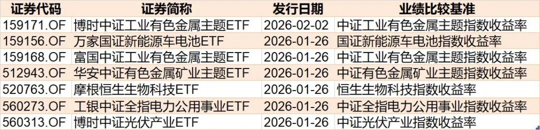 目前有6只ETF披露下周发行,跟踪标的为光伏、公用事业、生物科技、有色金属、电池等。