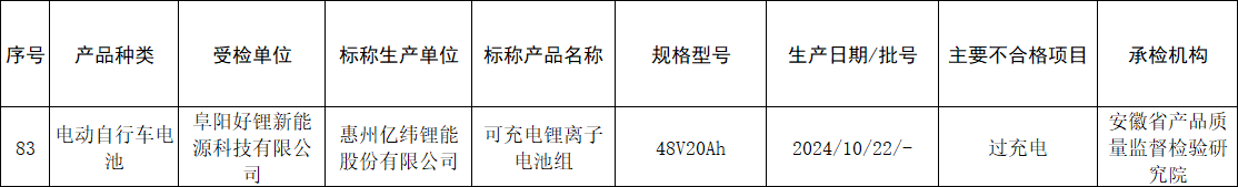 近日,安徽省市场监督管理局组织开展了电动自行车电池等84种产品质量省级监督抽查,并将抽查情况进行通报。其中,本次共抽查了30批次电动自行车电池产品,抽查发现1批次标称生产单位为“惠州亿纬锂能股份有限公司”的可充电锂离子电池组不合格,不合格项目为过充电。