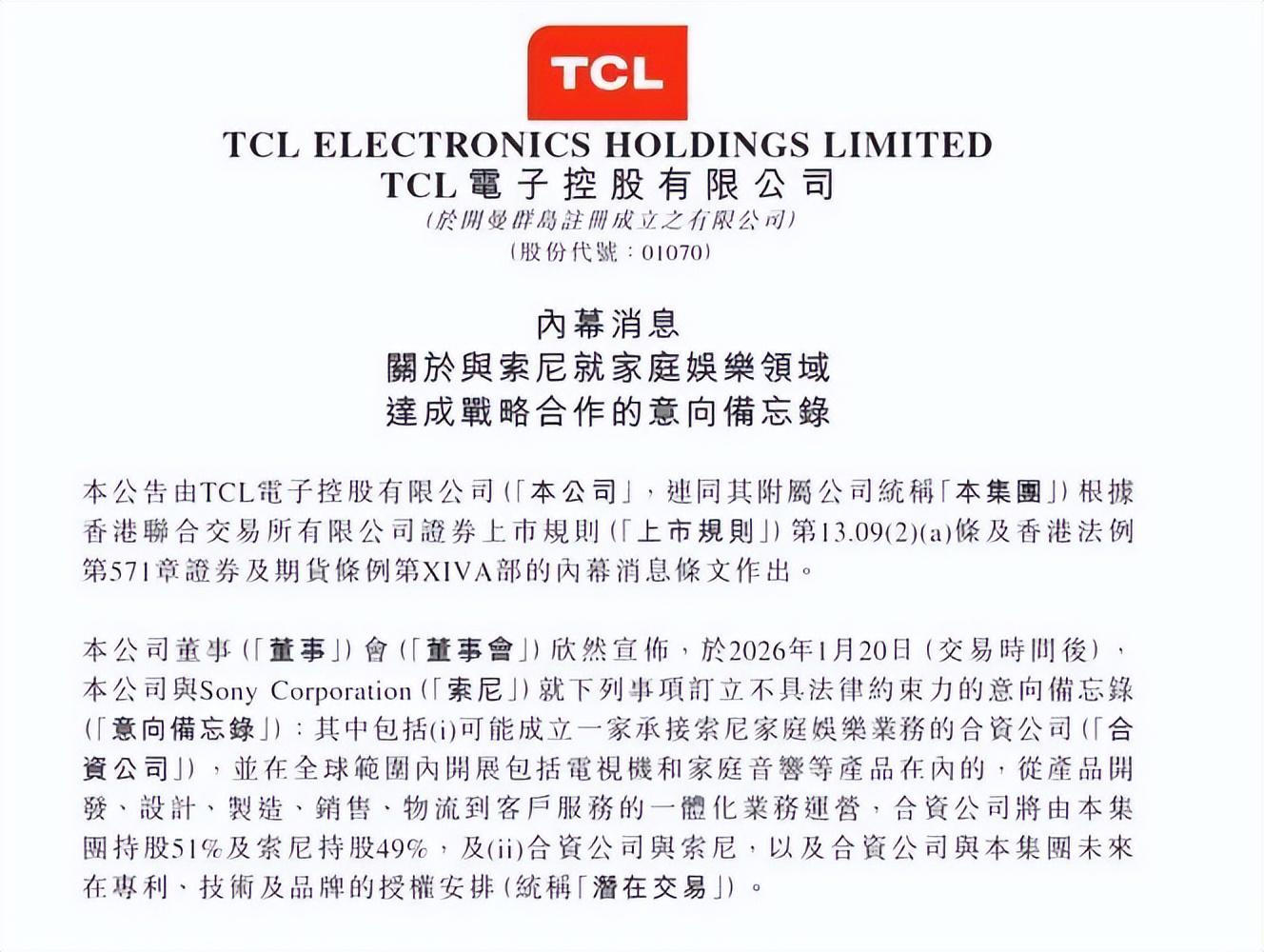 1月20日晚,TCL电子在港交所发布公告,宣布与索尼公司签署意向备忘录,计划成立一家承接索尼家庭娱乐业务的合资公司,由TCL电子持股51%、索尼持股49%。