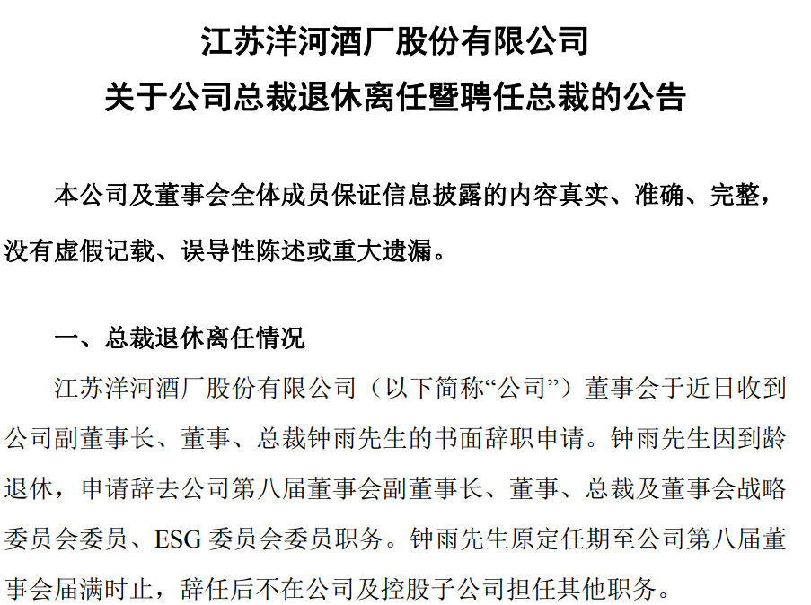 最后,和业绩预告一同披露的,还有洋河股份总裁离任和聘任新总裁公告。