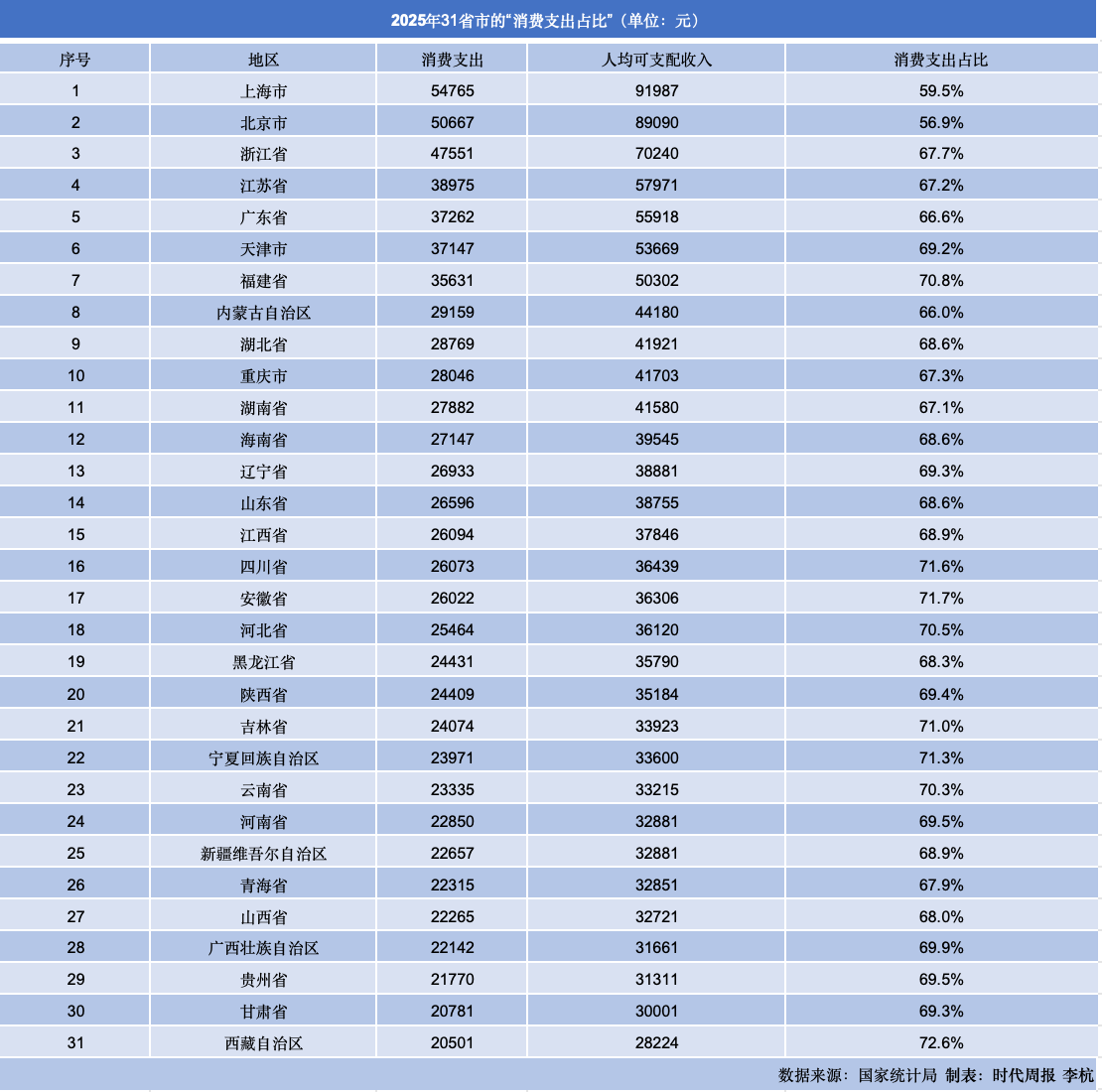 时代周报记者梳理发现,我国“消费支出占比”数值最小的三个省份为北京56.9%、上海59.5%和内蒙古66%。