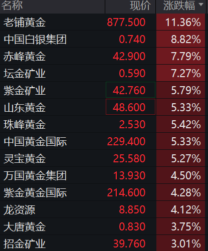 贵金属板块大涨,老铺黄金现涨超11%,中国白银集团涨超8%,赤峰黄金涨超7%,紫金矿业、山东黄金、珠峰黄金、灵宝黄金、中国黄金国际等涨超5%。