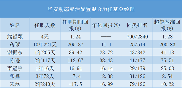 《每日财报》注意到,蒋璆离职后,继任基金经理的投资风格及能力能否匹配,就成为投资者重点关注的问题。例如,华安动态灵活配置混合的继任基金经理是熊哲颖,其累计任职时长约4年,属于新生代基金经理。