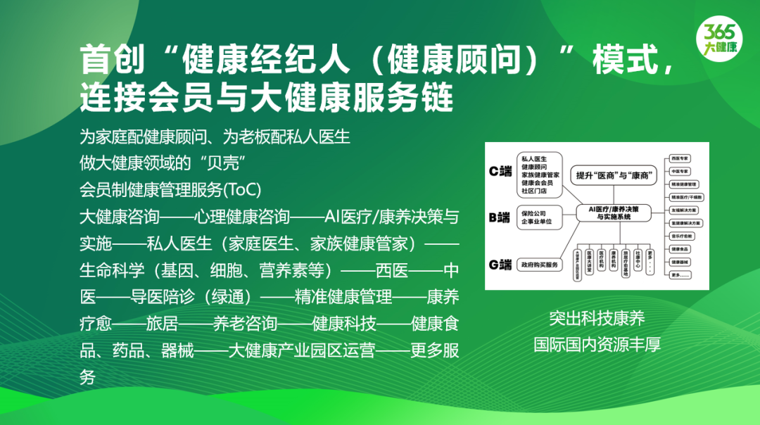 今天,我们会启动365企业家俱乐部,护航企业家,与高端医疗机构、健康管理机构、生命科学机构、名医专家合作,为高净值人群服务,为名医私人医生服务,中央首长级保健服务,高端深度体检及建档跟踪。