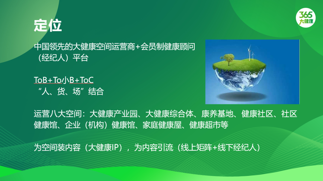 它的定位是中国领先的大健康空间运营商、会员制健康顾问,2B+2b+2C,大健康产业园、大健康综合体,就是在医院旁边的综合体,依托医院做的大健康综合服务,康养基地、健康社区、社区健康馆、企业健康馆、健康超市等等。