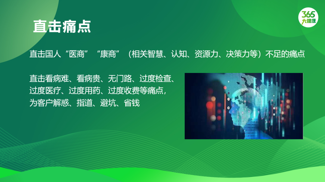 我们要直击痛点,国人的医商、康商是不够的,相关的智慧、认知、资源力、决策力是不够的,我有一个80后有四个老人、三个孩子,60岁以上的人群中,从50岁开始,不管是个人和家族都有各种健康需求要解决,不知道怎么决策,现在有专家、AI决策,有平台帮助你,有健康顾问来辅导,我们会直击看病难、看病贵、无门路、过度检查、过度医疗、过度用药等等问题。