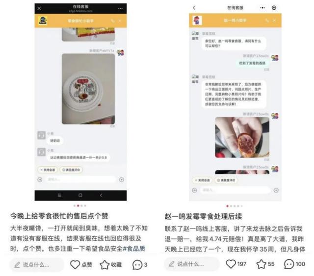 另一位怀孕的女士透露,在鸣鸣很忙旗下的“赵一鸣”购买的香肠发霉了,尽管客服很快响应、赔偿,但她还是提心吊胆了好几天。