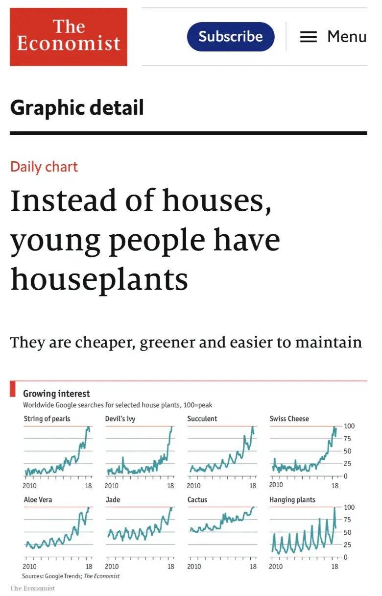 在那篇2018年报道中,他们发现在当代年轻人在经济窘迫的环境下,居住环境大不如前,面对买房困难、租房简陋的时代大背景,追逐植物的热潮,就是一种妥协的生活方式。