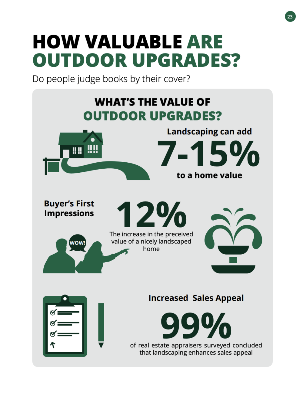 旧金山房地产公司Green Banker Real Estate在2025年发布的一份销售指南,他们的数据指出完善升级房屋庭院,可使售价上涨7-15%