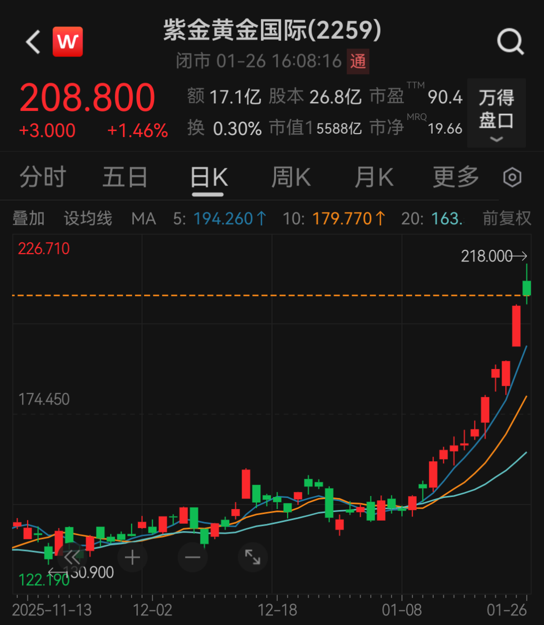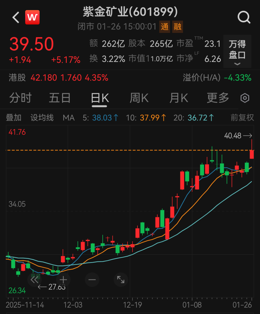 截至1月26日收盘,紫金矿业A股股价报39.5元/股,最新市值为1万亿元人民币;紫金黄金国际股价报208.8港元/股,最新市值为5588亿港元。