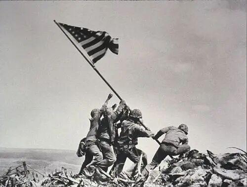 这张照片令海叔想起了二战时期的一张经典照片。1945年2月23日,美联社记者乔·罗森塔尔拍摄的,在硫磺岛美国海军陆战队第5师第28团士兵在折钵山第二次竖起国旗的场景。